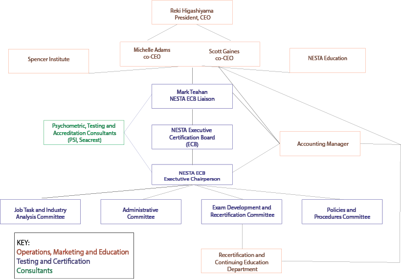 The Executive Certification Board is not responsible for the accreditation of educational or training programs leading to the certification. Education, marketing, staffing, and office location are determined by NESTA and are not under the domain of the ECB.